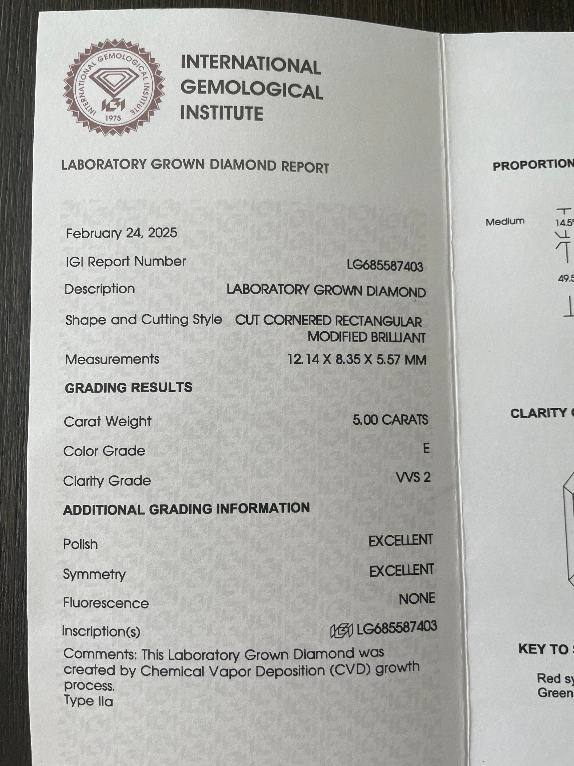 5.00 Carat Lab Grown Radiant Diamond Ring – E / VVS2 – IGI Certified