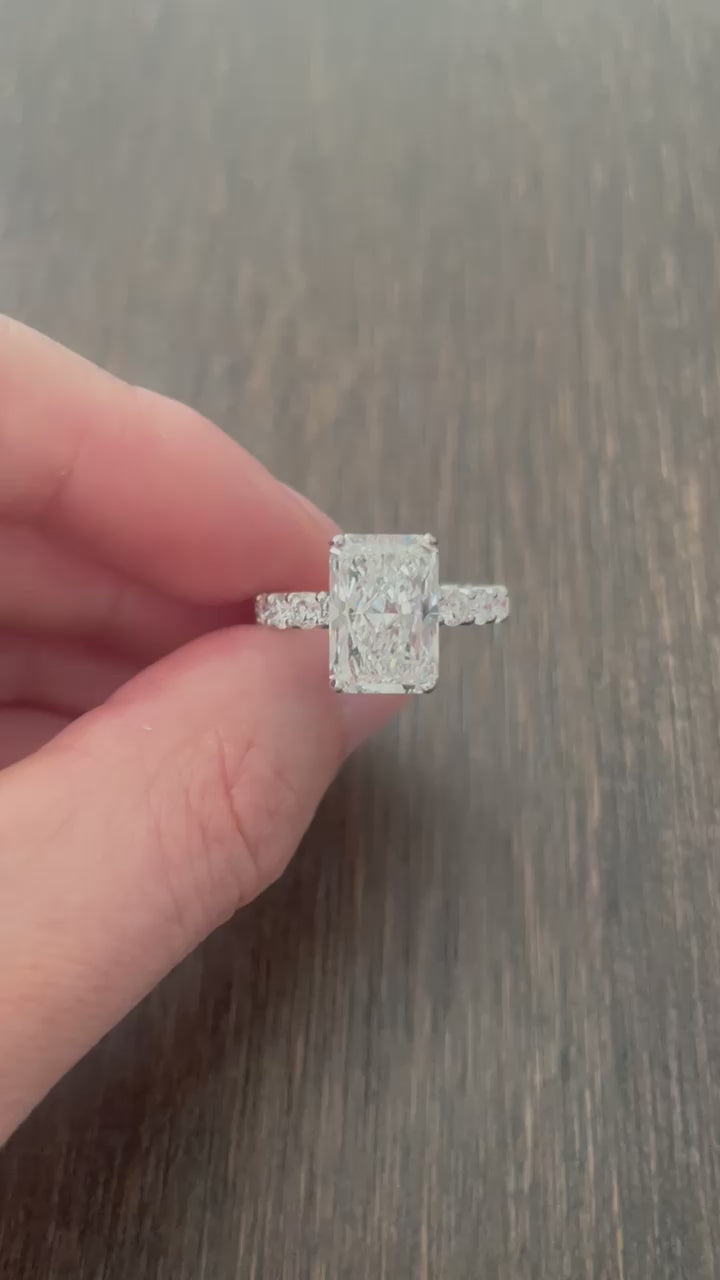 This ring is a true showstopper, featuring a dazzling 5.00 carat radiant cut lab-grown diamond. With its perfect rectangular shape and incredible sparkle, it makes an unforgettable statement.